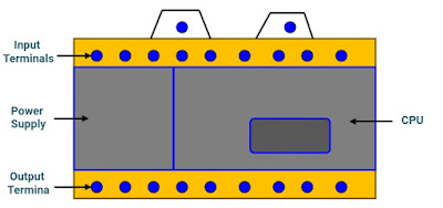 The power supply is modular, line voltage and hooked up to the right or left or any other position on the rack or chassis. The CPU is installed in the right or left position next to the power supply. It is specifically a plug-in module. These are medium size and large PLC modular. Inputs / outputs of medium-sized PLCs are calculated to be less than 1024 Kb and large-sized PLCs count more than 1024Kb. The diagram shows the modular input / output PLC